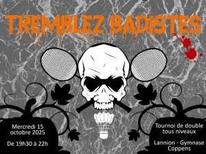Cette année encore, le Trégor bad vous propose une soirée de convivialité sur le thème d’Halloween. Réservez votre soirée du mercredi 15 octobre pour un événement des plus glaçants et des plus sympas ! N’hésitez pas à venir avec votre maquillage le plus effrayant et votre déguisement le plus flippant… et apportez votre plat ou dessert …